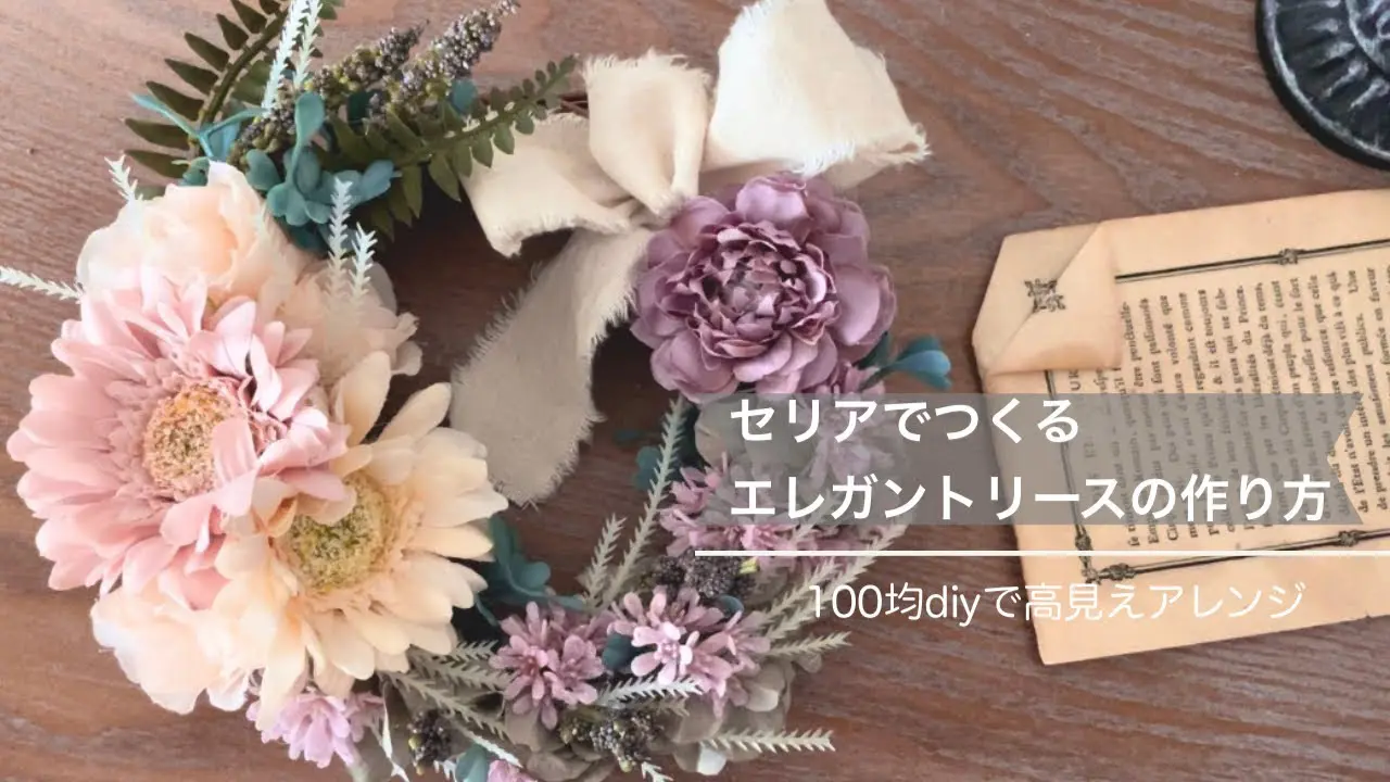| タイトル | 【セリアでつくる】パリジェンヌ風エレガントリースの作り方 100均diyで花材費800円 |