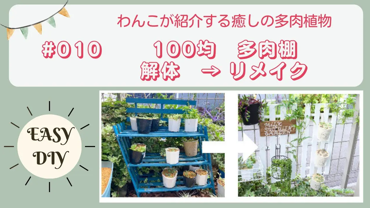 | タイトル | 【わんこが紹介する癒しの多肉動画 #010】100均スノコ棚の解体→リメイク |