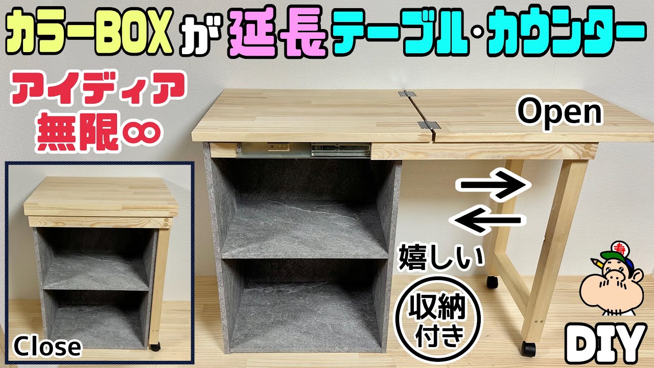 | タイトル | 【DIY】【カラーBOX】【テーブル】【カウンター】天板を延長させる方法!!必要じゃない時はコンパクトに出来る!!アイデア無限大です!!テーブル、机、カウンター等として使えて、さらに嬉しい収納付き!! |