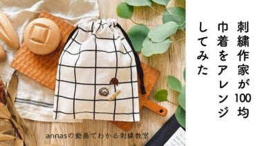 【セリアのきんちゃくにパン刺繍】刺繍作家が100均(seria)のきんちゃくに刺繍してみた|annas 川畑杏奈「annasのおいしい刺繍CAFE&SWEETS」(河出書房新社) – annas川畑杏奈